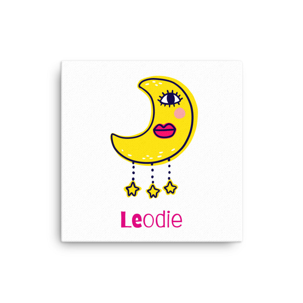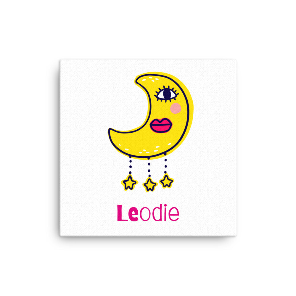 Customizable only on Leodie.co - Brighten your nursery with our Charmed Crescent Moon Thin Canvas Print, designed in a vibrant funky pop art style. Perfect for adding a playful touch to your baby's room, this unique piece brings color and whimsy to any decor. Shop now to create a cheerful and stylish space for your little one.