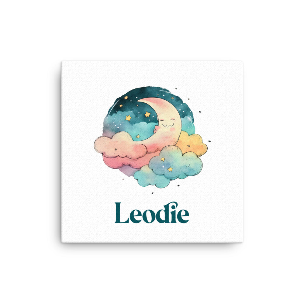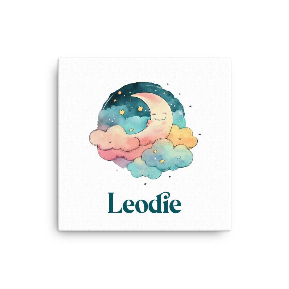 Customizable only on Leodie.co - Transform your nursery with our Sleepy Moon and Stars Thin Canvas Print. Featuring a charming watercolor art style, this adorable print adds a touch of whimsy to your baby's room. Perfect for baby clothes and decor enthusiasts, this cute design creates a serene and magical atmosphere. Shop now to elevate your nursery decor with this delightful and soothing wall art.